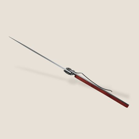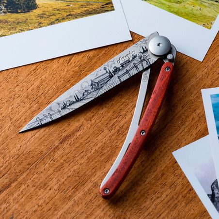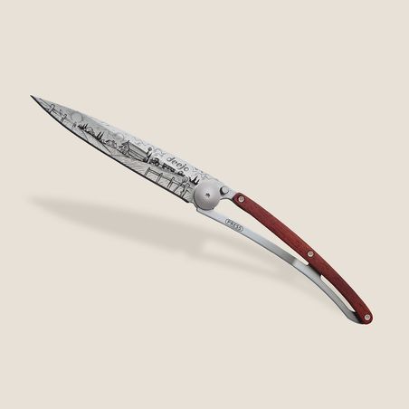 Ce couteau Deejo est orné d’une plaquette en bois corail (ou Padouk) massif. Cette essence de bois est utilisée de longue date en coutellerie pour ses précieux reflets rouges / ambrés (d'où son nom), sa robustesse et son excellente résistance à l'humidité. Il souligne ici merveilleusement l'élégance d'un couteau Deejo.